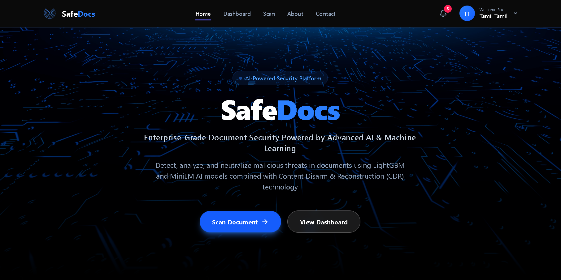 SafeDocs is an intelligent cybersecurity platform designed to protect users from document-based malware. It allows users to upload files which are instantly analyzed by a hybrid AI engine. The system determines a "Verdict" (Malicious or Benign) based on concrete evidence—such as the presence of obfuscated JavaScript or VBA macros—rather than just arbitrary risk scores. Malicious files are automatically "sanitized" (cleaned) and returned to the user safe to open.